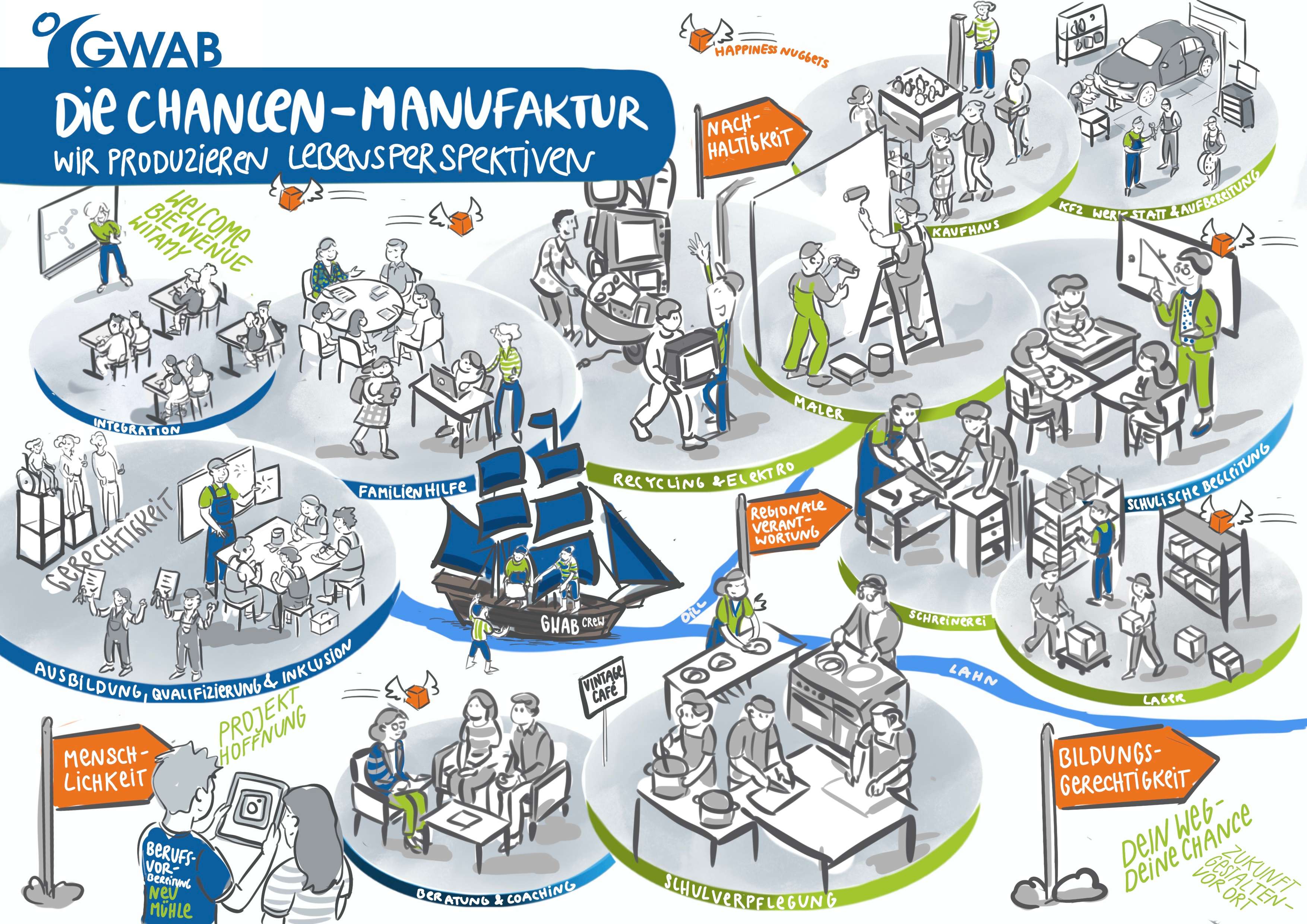 Die GWAB nimmt als gemeinnützige Gesellschaft des Lahn-Dill-Kreises vielfältige Aufgaben zur Integration in Ausbildung und Arbeit wahr: Beratung, Coaching, Qualifizierung, Berufsvorbereitung, Aus- und Weiterbildung sowie Beschäftigung von Langzeitarbeitslosen.